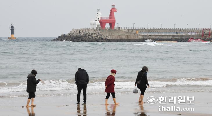 [한라일보] 26일 제주시 이호테우해수욕장을 찾은 관광객들이 바닷물에 발을 담그며 걷고 있다(사진 위). 이호테우해변에서 보트를 타며 초봄을 즐기는 관광객들(사진 아래). 이상국기자