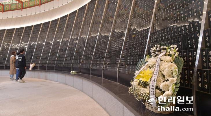 제75주년 4·3을 일주일여 앞둔 26일 제주4·3평화공원을 찾은 도민들이 위패봉안실을 둘러보고 있다. 이상국기자