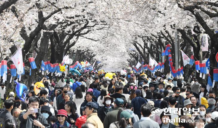 [한라일보] 코로나19로 중단됐다가 4년 만에 왕벚꽃 축제가 열린 26일 제주시 전농로에 왕벚꽃을 구경하기 위해 몰려든 시민들로 인산인해를 이루고 있다. 이상국기자