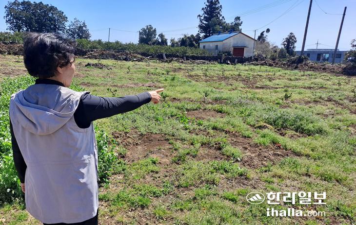 밭 주인이 감귤 묘목 도난 현장에 대해 설명하고 있다. 피의자들은 잘 자란 묘목만 골라 훔치는 대범함을 보인 것으로 알려졌다.