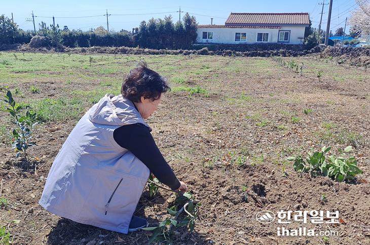 밭 주인이 도난 과정에서 피의자들이 버리고 간 묘목을 다시 심어 돌보고 있다.