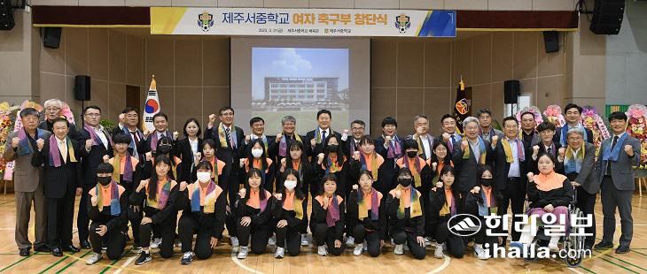 지난 31일 제주서중학교 체육관에서 열린 여자축구부 창단식에서 선수단이 내빈들과 기념촬영을 하고 있다.