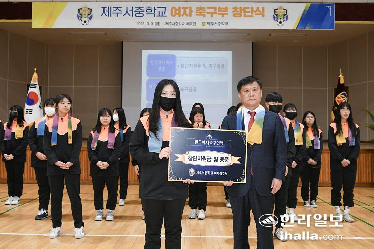 한편 이날 창단식을 가진 제주서중 여자축구부에는 제주도체육회(회장 송승천)의 창단 지원금과 한국여자축구연맹(회장 오규상) 및 제주도축구협회(회장 윤일), 제주유나이티드FC가 창단지원금과 축구용품 등을 지원하며 응원을 아끼지 않았다.
