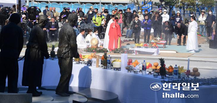 제75주년 제주4·3 추념식을 하루 앞둔 2일 도내 최대 규모 수용소였던 곳으로 4·3의 아픔을 간직한 '주정공장수용소 4·3역사관' 야외공원에서 당시 억울하게 숨진 이들을 위로하기 위한 위령제가 거행됐다. 강희만기자