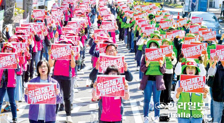 지난달 31일 제주도교육청 앞에서 임금 체계 개편을 요구하는 제주학교비정규직연대 총파업 집회가 열렸다. 이상국기자