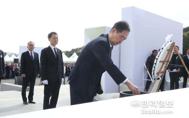 이에 정부 대표로 한덕수 국무총리가 참석해 대통령 명의의 추념사를 대독했다.