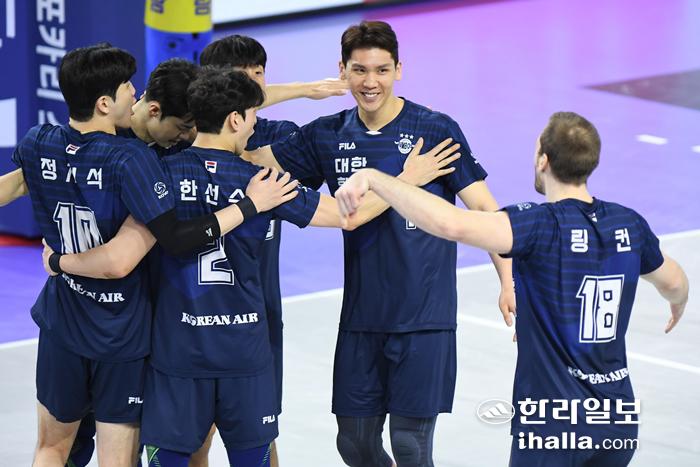 환호하는 대한항공 선수들. 연합뉴스