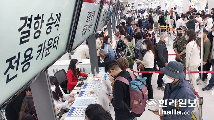 [한라일보] 5일 제주공항에 내려진 급변풍특보로 50여편의 출·도착 항공편이 무더기로 결항됐다. 이로인해 제주를 출발하지 못한 승객들이 대기좌석을 구하기 위해 항공사 카운터로 몰리면서 큰 혼잡을 빚고 있다.