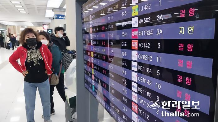 5일 오전 강풍특보로 제주공항의 항공편 결항이 속출했다. 강희만 기자