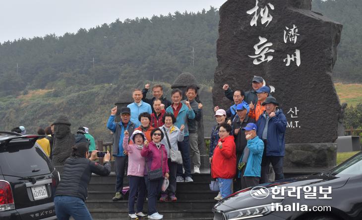 간간이 비가 흩뿌린 5일 서귀포시 대정읍 송악산을 찾은 관광객들이 송악산 표지석 앞에서 기념촬영을 하며 제주에서의 추억을 새기고 있다. 이상국기자