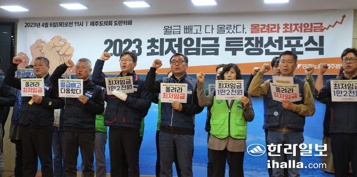민주노총 제주본부 관계자들이 6일 제주도의회 도민카페에서 '최저임금 투쟁 선포 기자회견'을 진행하고 있다. 김도영기자