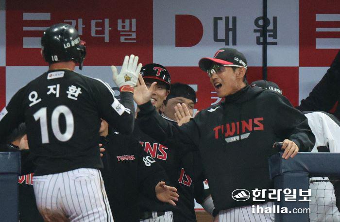 지난 6일 경기에서 하이파이브 하는 오지환(왼쪽)과 염경업 감독. 연합뉴스