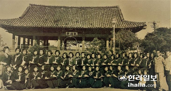 도내 수학여행이 이뤄졌던 1964년 관덕정을 방문한 서귀여자중학교 수학여행단. 제주교육박물관 제공