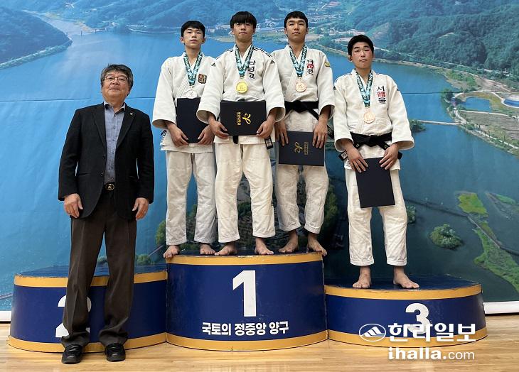 9일 강원도 양구문화체육회관에서 열린 2023 용인대총장기 전국 남녀중·고등학교 유도대회 남고부 -60㎏급 시상식에서 강만순 제주도유도회장이 시상후 수상자들과 기념촬영을 하고 있다.