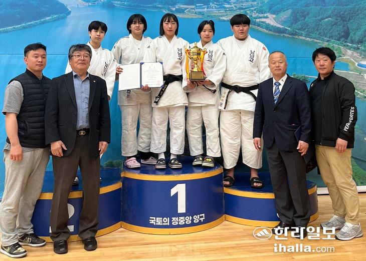 2023 용인대총장기 전국유도대회 여고부 단체전에서 준우승을 차지한 남녕고. 왼쪽부터 김영동 지도자, 강만순 제주도유도회장, 홍규리, 고미소, 김예림, 정혜원, 이현지, 임병기 감독, 현후익 도유도회 전무이사.