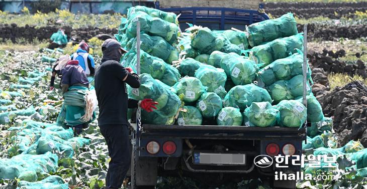 11일 제주시 한림읍 밭에서 한 농민이 수확한 양배추를 트럭에 싣느라 분주한 모습이다. 이상국기자