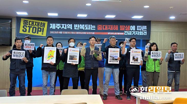 민주노총 제주본부 관계자들이 12일 제주도의회 도민카페에서 기자회견을 열고 있다.