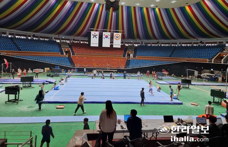 12일 제주시 한라체육관에서 제78회 전국종별체조선수권대회에 참가하는 선수들이 공식연습에 나서고 있다.