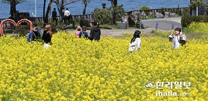 12일 제주시 용연계곡 인근 유채밭을 찾은 관광객들이 유채꽃을 배경으로 기념사진을 찍고있다. 이상국기자