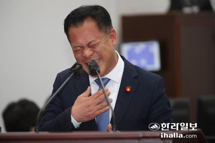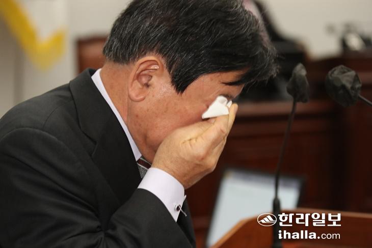 김대진 의원이 김 교육감과 장애인예술단 운영을 놓고 일문일답을 이어가던 중 눈물을 보이고 있다. 제주도의회 제공