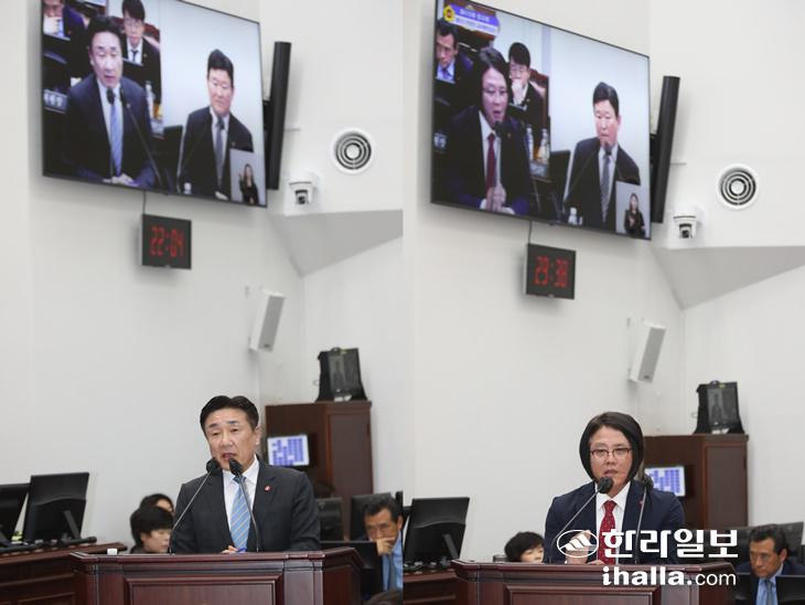 양경호 의원(왼쪽)과 현기종 의원(오른쪽)이 14일 김광수 교육감을 상대로 잇따라 교육 행정 질문에 나서고 있다. 제주도의회 제공