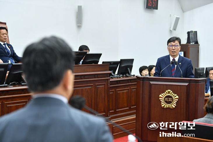 이남근 의원이 학교 통합운영을 제안하며 김광수 교육감에게 보충 질문을 하고 있다. 제주도의회 제공