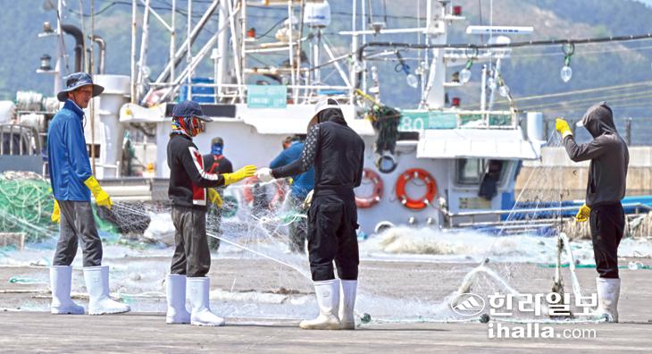 17일 제주시 한림항에서 어민들이 만선을 꿈꾸며 그물 정리 작업을 하느라 분주하다. 이상국기자