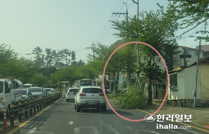 18일 제주시 영평초등학교 인근 도로에 강풍의 영향으로 가로수가 쓰러져 차량 통행에 불편을 주고 있다. 독자 제공