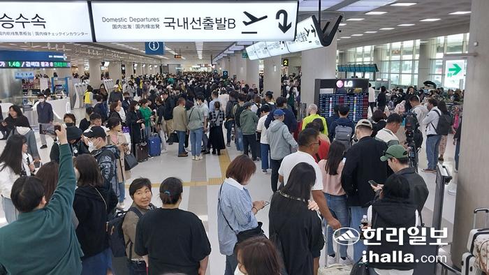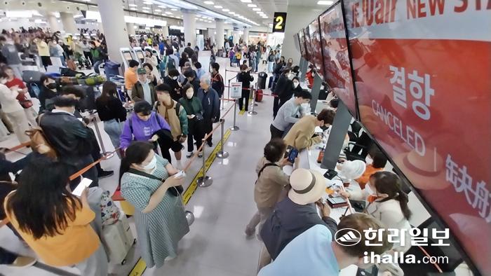 강풍으로 항공편이 잇따라 결항되면서 제주공항 출발대합실이 크게 붐비고 있다. 강희만 기자