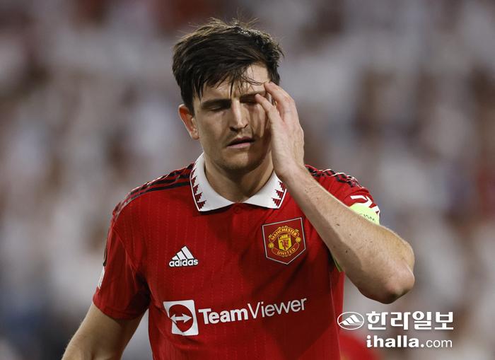 괴로운 표정을 짓는 맨유의 주장 해리 매과이어. 연합뉴스