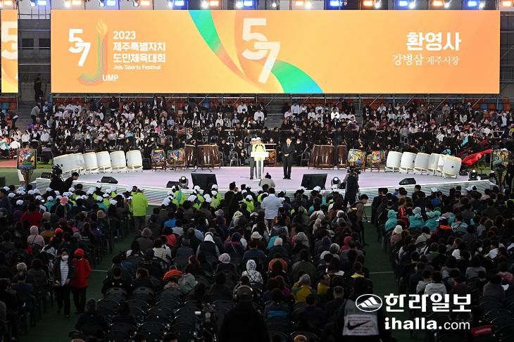 21일 한림종합운동장에서 열린 제57회 도민체육대회 개회식에서 강병삼 제주시장의 환영사와 김경학 도의회 의장과 김광수 제주도 교육감이 축하의 메시지를 전달하고 있다. 강희만 기자