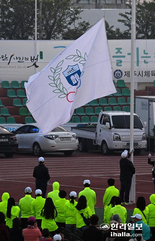 21일 한림종합운동장에서 열린 제57회 도민체육대회 개회식에서 대회기가 게양되고 있다. 강희만 기자
