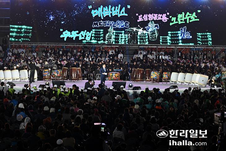21일 한림종합운동장에서 제57회 도민체육대회 개회식에서 오영훈 지사가 메타버스를 이용해 격려사를 하고 있다. 강희만 기자