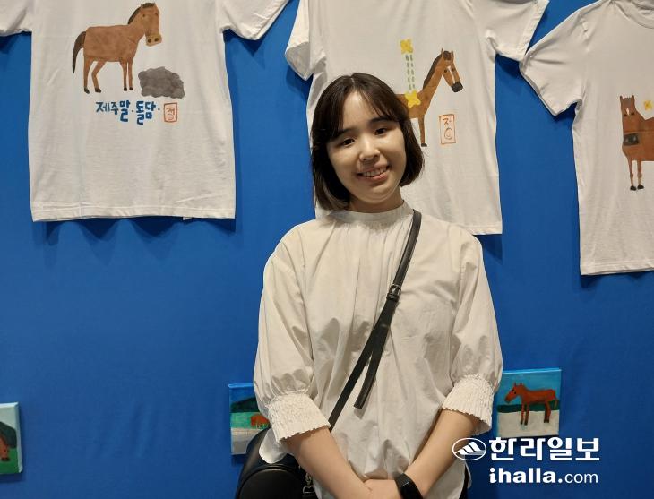 김현정 작가가 지난 20일 자신의 티셔츠 작품 앞에서 환하게 웃고 있다. 그가 그림마다 남기는 사인 '정'의 'ㅇ'도 환히 웃는다. 김지은기자