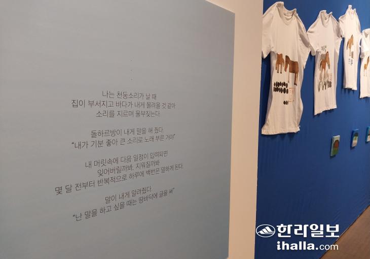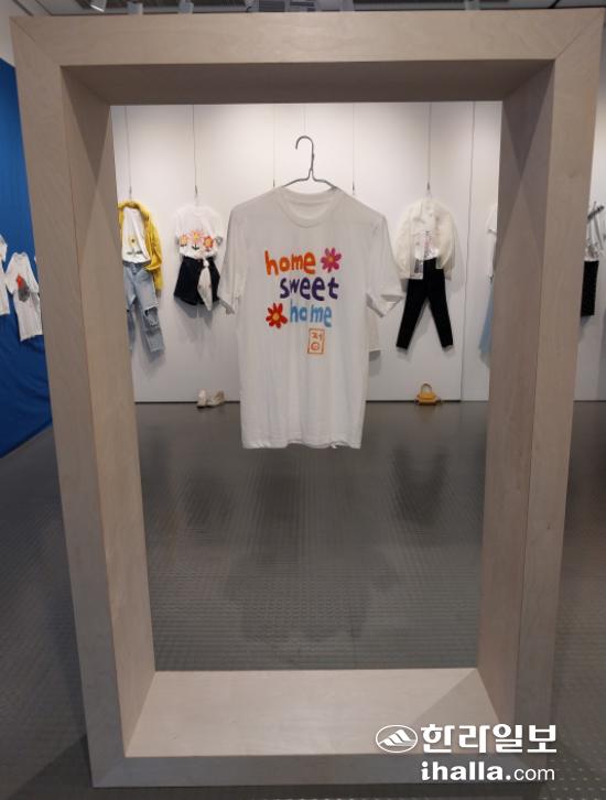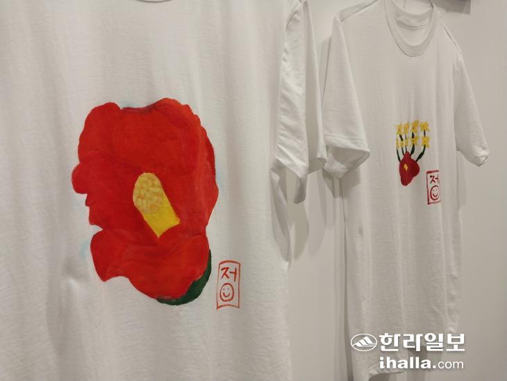 현정 씨는 이번 전시를 준비하며 처음으로 흰색 반팔 티셔츠를 캔버스로 삼았다. 지난 2021년에 기획해 차곡차곡 완성한 티셔츠 작품 50여 점이 선보이고 있다. "어느 한 곳에 머물러 있지 않고, 어디든 함께 동행할 수 있는 티셔츠로 소통하고자 한다"는 뜻이자, 그동안 받은 사랑을 돌려 주고 싶다는 표현이다. 전시가 끝나면 모든 티셔츠 작품은 기부될 예정이다.