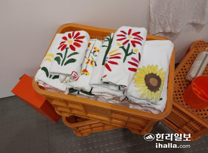 김현정 작가의 티셔츠 작품. 올해 안에 캄보디아 프놈펜에서 다시 한 번 전시한 뒤 현지 뜨라핑크라상 초등학교 학생들에게 기부할 예정이다.