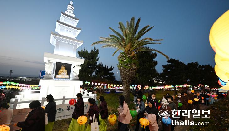 불기 2567 부처님 오신날(5월 27일)을 앞두고 제주불교연합연등축제위원회 주관으로 지난 22일 제주시 도령마루에 세워진 탑 앞에서 불자들이 탑돌이를 하고 있다. 이상국기자
