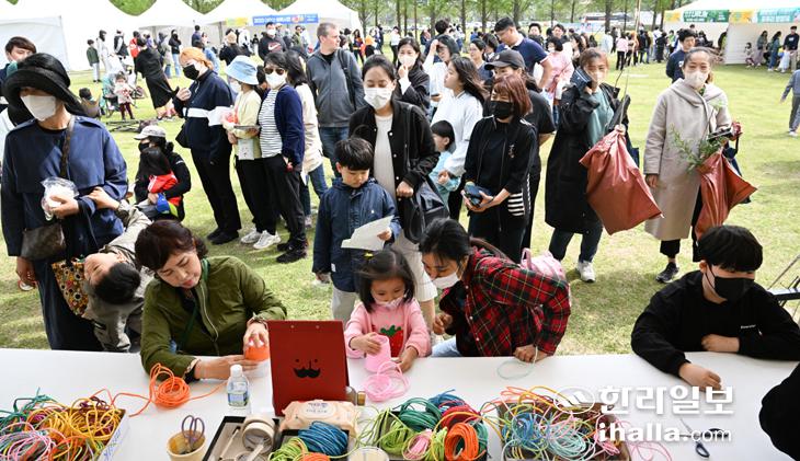 제53회 지구의 날 맞이 2023 지구환경축제가 열린 22일 제주시민복지타운 행사장에서 나무 나눔, 재활용 화분만들기, 어린이 벼룩시장 등 환경을 살리는 체험과 전시가 진행되고 있다. 이상국기자