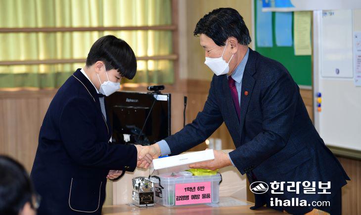 지난 3월 6일 제주중앙중에서 이뤄진 '드림노트북' 전달식 장면. 한라일보DB