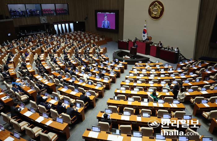 27일 국회 본회의에서 국민의힘 의원들이 특검법 투표 전 퇴장하고 있다. 연합뉴스