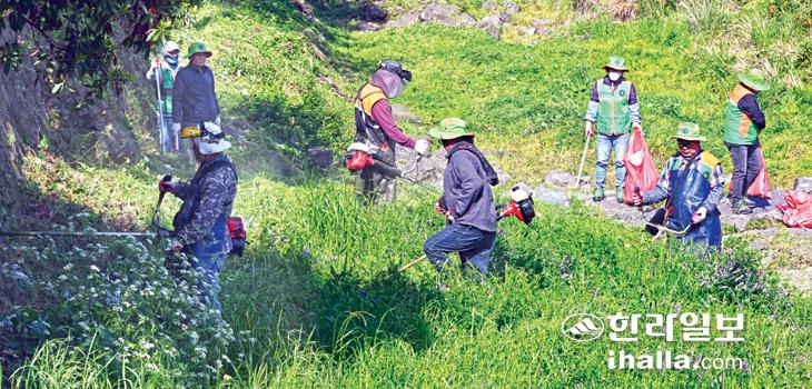 27일 제주시 병문천에서 오라동 자율방재단이 하천 정비 작업으로 풀베기 작업을 실시하고 있다. 이상국기자