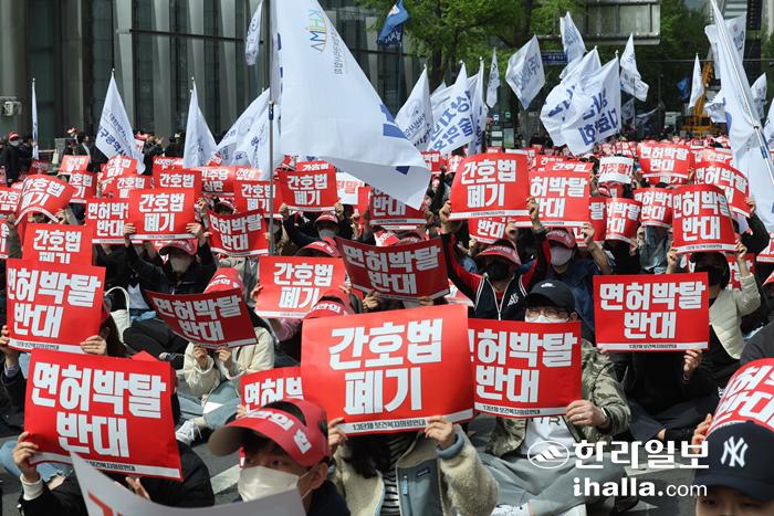 대한의사협회를 비롯한 13개 보건복지의료연대 관계자들이 16일 오후 서울시청 인근에서 열린 간호법·면허박탈법 저지 400만 보건복지의료연대 총파업 결의대회에서 관련 구호를 외치고 있다. 연합뉴스
