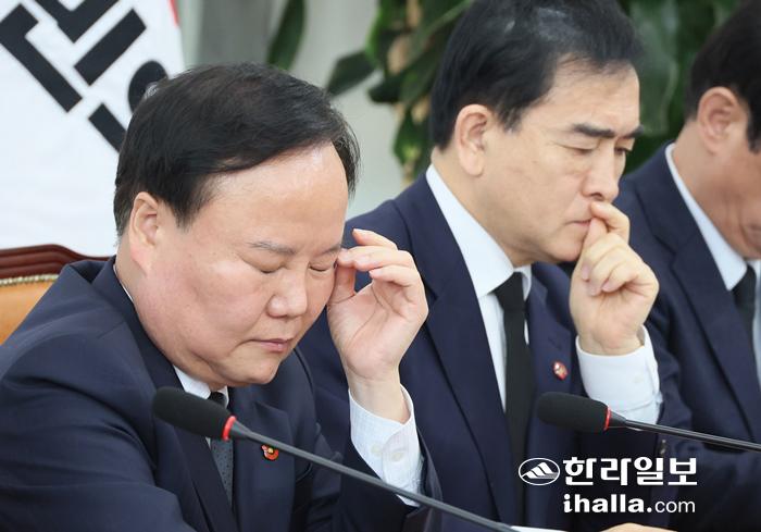 국민의힘 최고위원회에 참석한 김재원 태영호 최고위원.