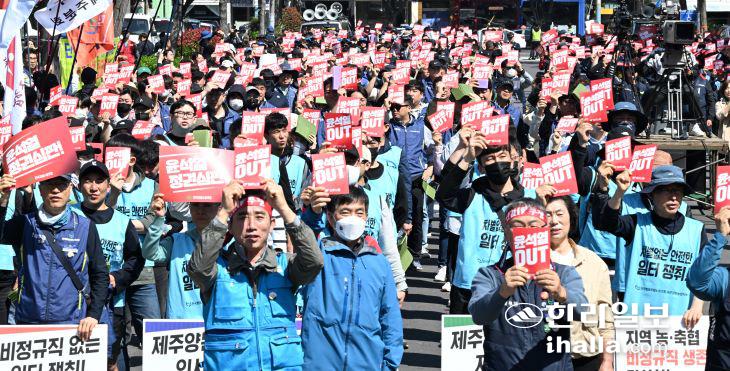 1일 제주시청 앞에서 열린 세계노동절 제주대회 참가자들이 피켓을 들고 구호를 외치고 있다. 이상국기자