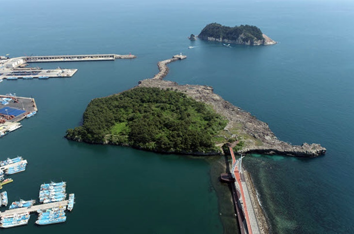 서귀포항과 새연교가 있는 새섬공원 전경.