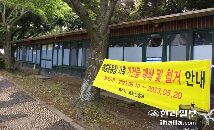 '애향 쉼터' 가건물 주변에 철거 안내를 알리는 제주시의 현수막이 내걸려 있다. 진선희기자