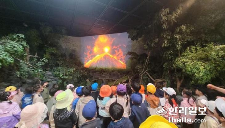 지난달 21일 교래곶자왈 생태체험관을 방문한 마야유치원생들이 화산폭발 과정을 배우고 있다. 사진=제주곶자왈공유화재단