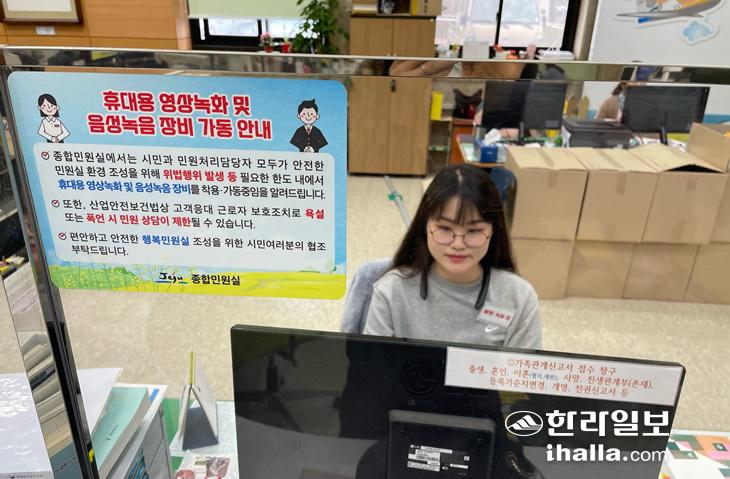 민원 담당 공무원 자리의 투명 칸막이 앞에 휴대용 영상 녹화, 음성 녹음 장비 착용·가동을 알리는 안내문이 붙어 있다. 제주시 제공