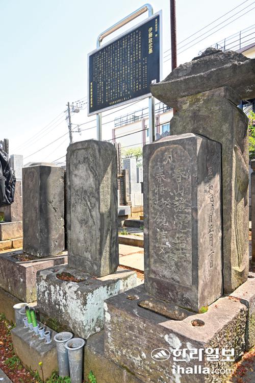 옛 소메이촌에서 왕벚나무를 처음 보급한 것으로 알려지는 이토 마사다케의 묘비. 고마고메 지역의 '서복사'라는 절 안에 있다. 강희만기자