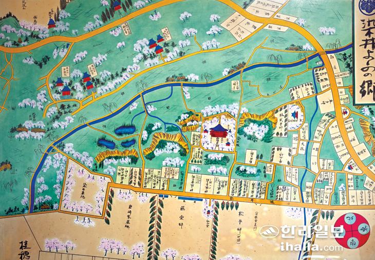 식목 장인들이 모여 살았던 옛 소메이촌을 표현한 그림. 그 오른쪽에 '소메이요시노의 고향'이라는 글이 적혀 있다. 강희만기자